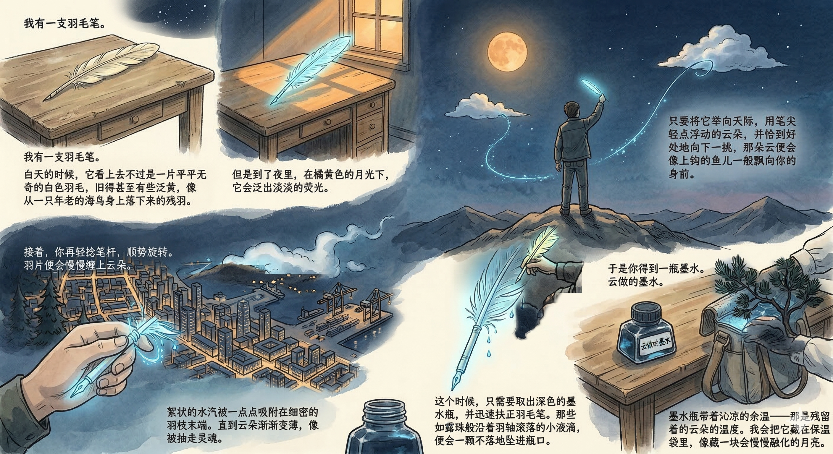 只要将它举向天际,用笔尖轻点浮动的云朵,并恰到好处地向下一挑,那朵云便会像上钩的鱼儿一般飘向你的身前。